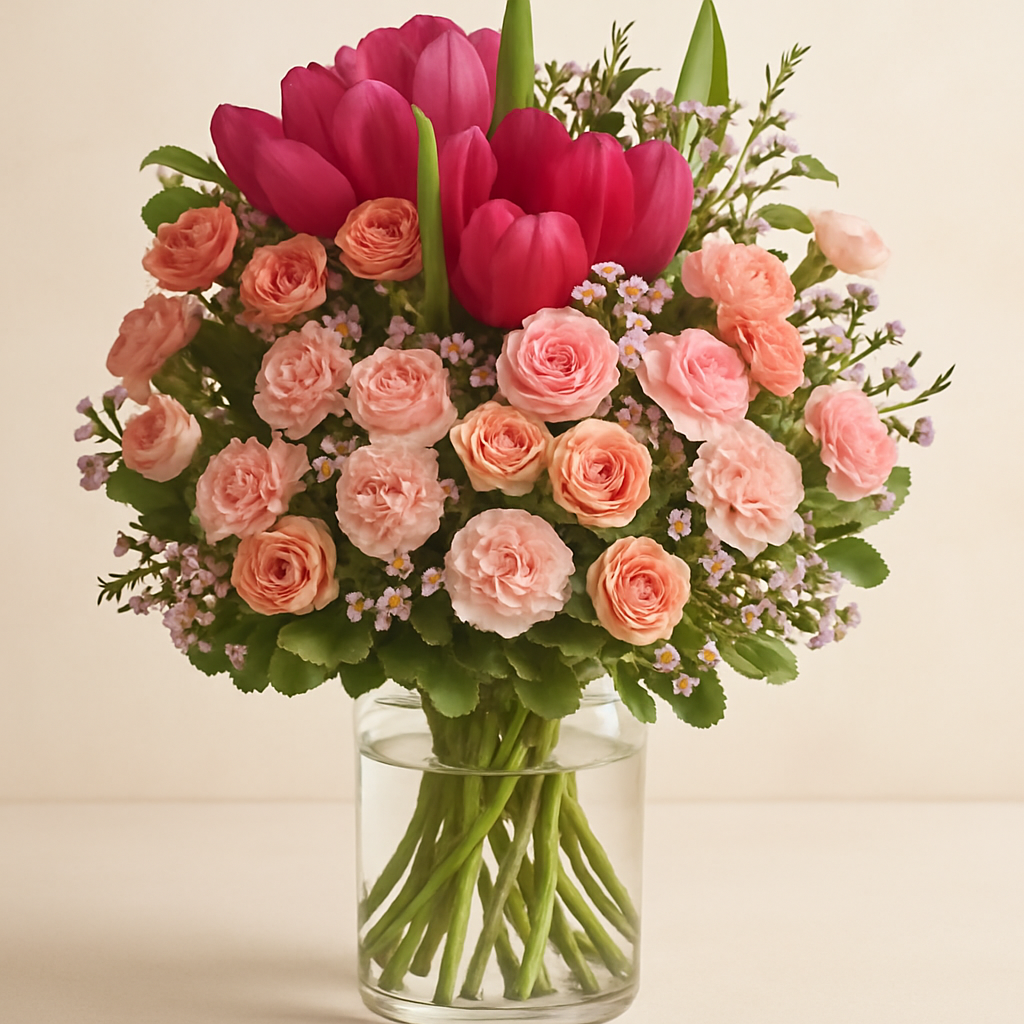Turn an ordinary moment into something special with this captivating hand-crafted bouquet of roses, tulips, designed to convey emotion beyond words. Thoughtfully created for brightening any day with unexpected beauty, each stem is carefully arranged by experienced local florists who understand the art of meaningful flower delivery. With international delivery available worldwide, the Tulip & Rose Embrace ensures your love and care travel any distance β arriving fresh, vibrant, and exactly when it matters most.